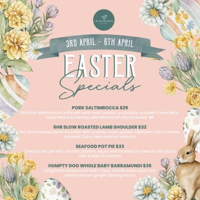 Easter Food Specials Friday, 03rd April 2026 to Monday, 06th April 2026 12:00am to 12:00am Categorised Under: Food Specials Hippity Hop into Lighthorse Kitchen! Enjoy our Easter Specials over the long weekend!