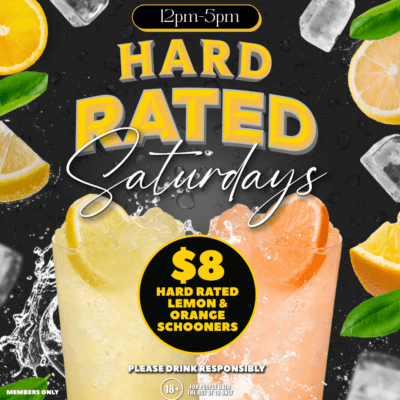 HARD RATED SATURDAYS Saturday, 18th April 2026 12:00pm to 10:00pm Categorised Under: Drink Specials HARD RATED SATURDAYS AT SPORTIES! $8 Hard Rated Schooners Saturday 12pm-10pm Members Only* PLEASE DRINK RESPONSIBLY