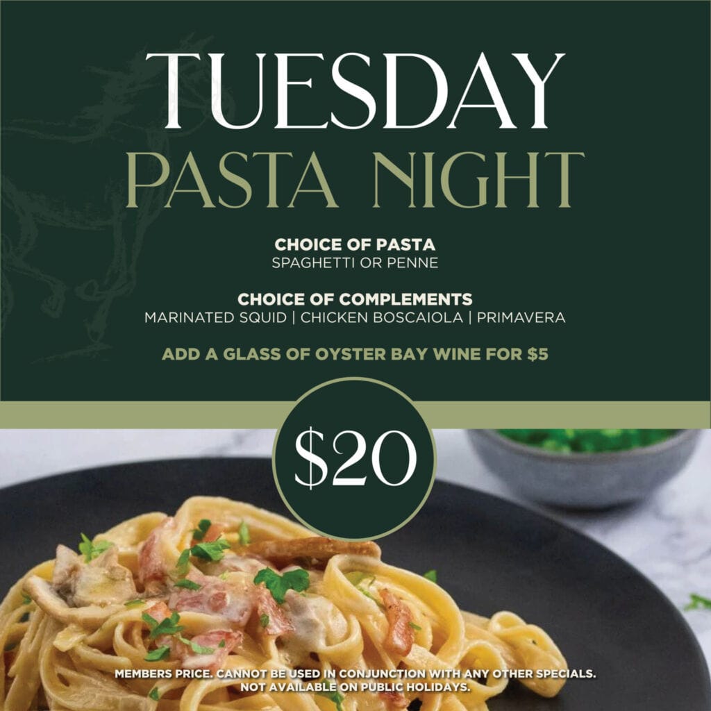 PASTA NIGHT Tuesday, 30th December 2025 05:30pm to 09:00pm Categorised Under: Food Specials TUESDAY PASTA NIGHT $20