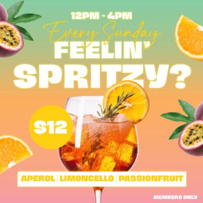 Spritzy Sunday’s Sunday, 12th October 2025 12:00pm to 04:00pm Categorised Under: Drink Specials Spritzy Sunday is Every Sunday from 12pm-4pm for just $12 with Aperol, Limoncello and Passionfruit to choose from!