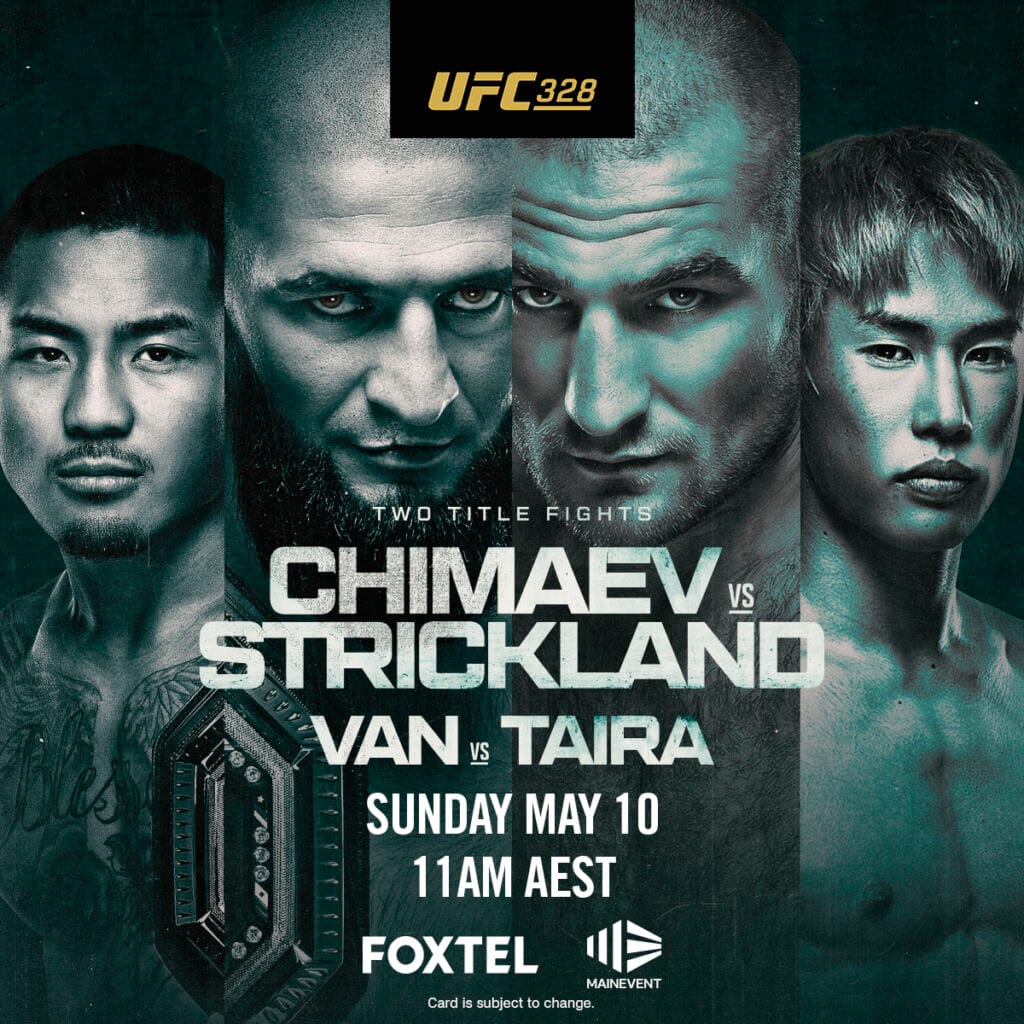 UFC 328 10/05/2026 11:00am Categorised Under: Special Events Khamzat Chimaev v Sean Strickland Khamzat Chimaev faces Sean Strickland in a high-stakes middleweight clash at UFC 328. Chimaev’s relentless grappling meets Strickland’s sharp striking in a fight with serious title implications.