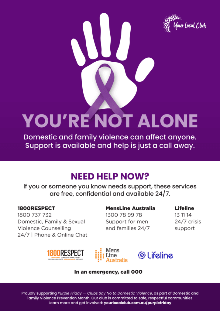We are proudly supporting Purple Friday – Clubs Say No to Domestic Violence. As part of Domestic and Family Violence Prevention Month, we will be joining over 200 clubs across NSW as our club turns purple for the day. Together with our staff, we will raise awareness and help create safer communities.